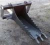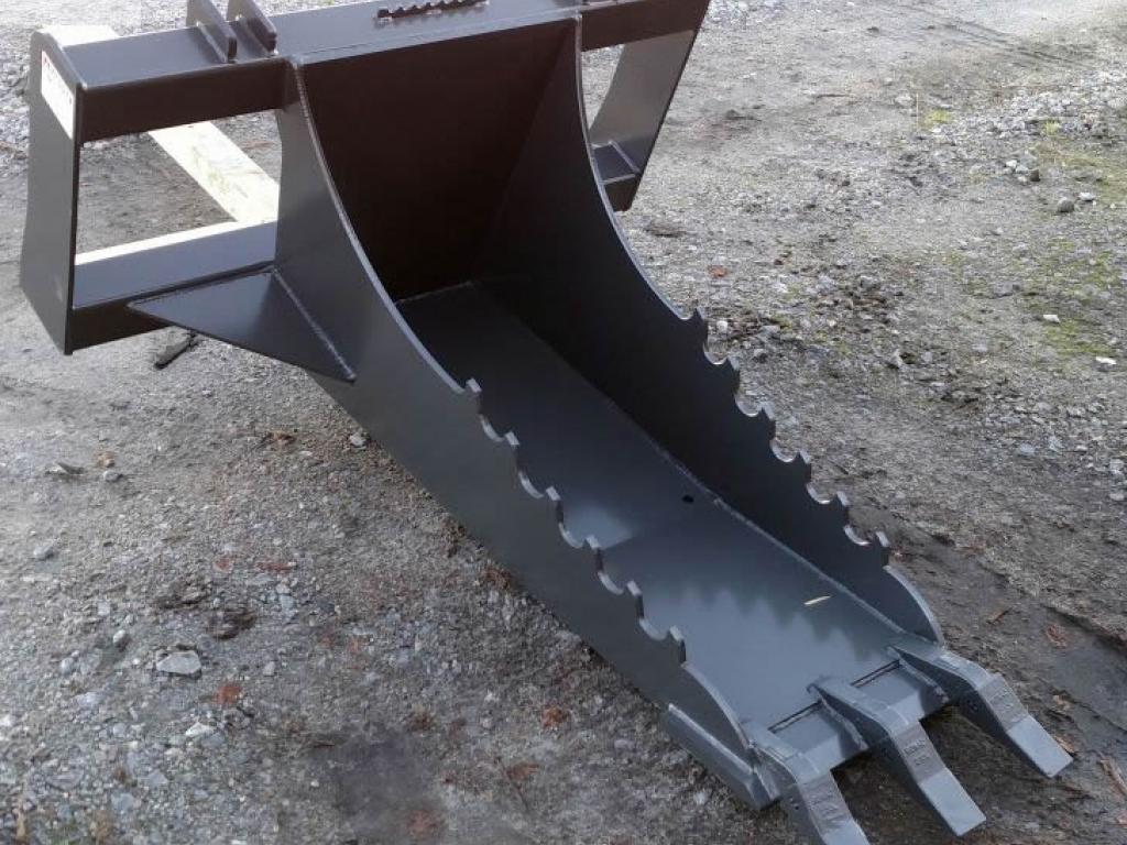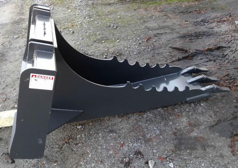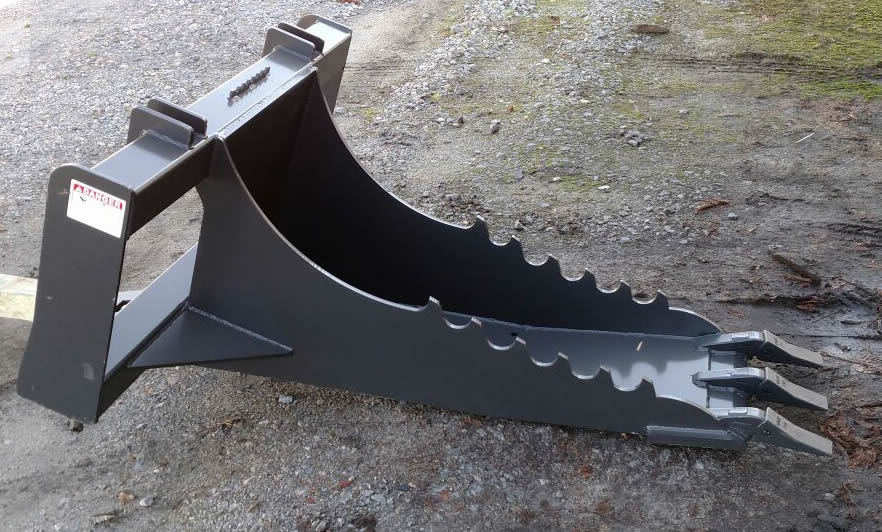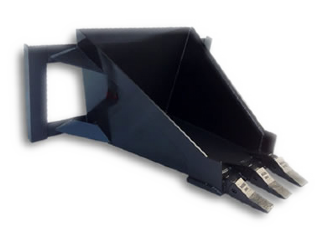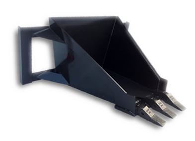 Angled toward the front to keep the dirt from “sticking” inside the bucket
